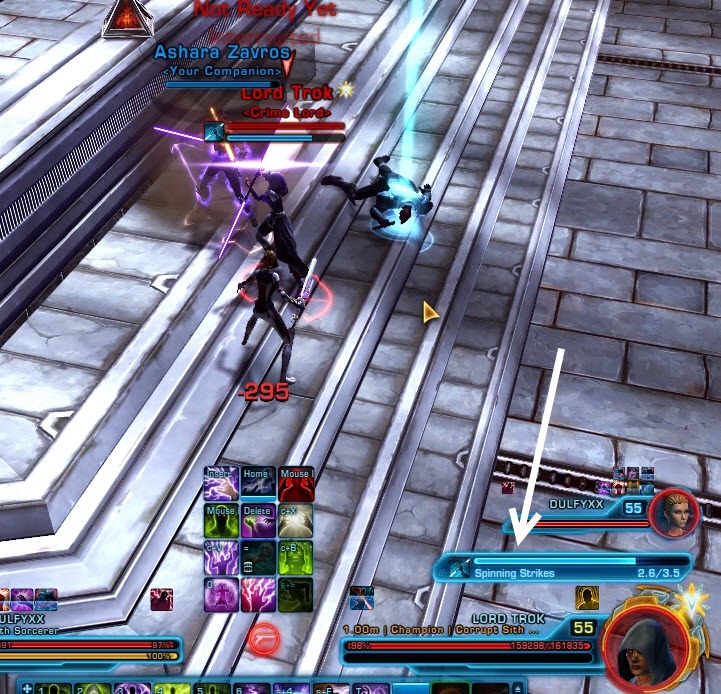 - Adds: At 50%, Lord Trok will use Force Barrier and is immune to all damage for 60 seconds. When this happens, a Sith Spawn add joins the fight with 54k HP. Killing the Sith Spawn will end the Force Barrier. If you fail to kill the Sith Spawn after 60 seconds, Lord Trok will join the fight.