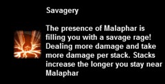 Tanks: The challenge is that the main tank will continue to gain Savagery stacks, increasing damage received, since the main tank is unable to run out of Malaphar’s circle. This means that you will need to periodically tank swap. The logical timing is with each set of add spawns. One good way to do this is drag Malaphar to the new add location. The tank with Malaphar will aggro and AoE taunt the adds. Once this has been done, the off tank will single taunt Malaphar and step in front, while the old tank